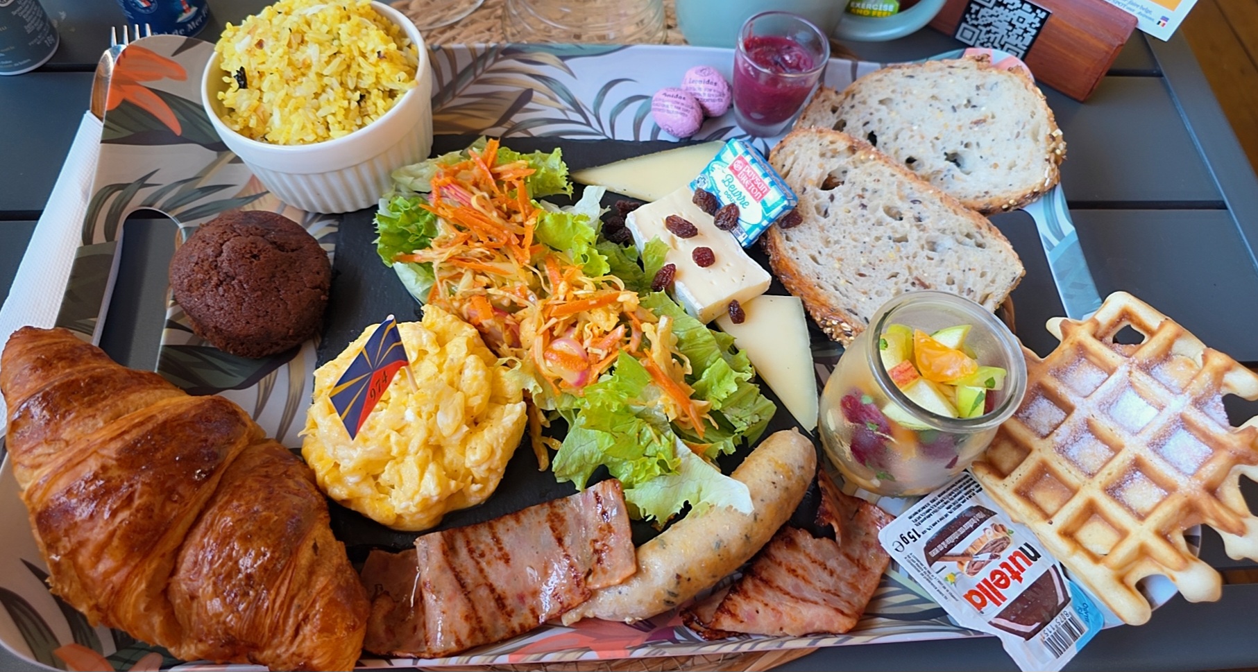 Salade fraîche • Fromage • Jambon poulet • Saucisse poulet • Œufs brouillés • Riz chaud • Mini viennoiseries • Gaufre au Nutella • Gâteau maison • Fruits frais • Tranche de pain avec beurre et confiture • Boisson chaude au choix + jus